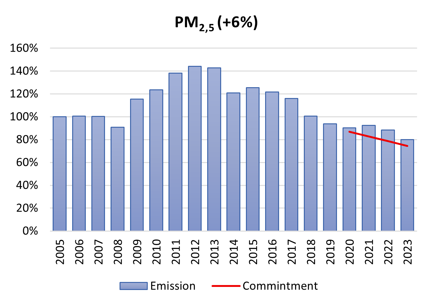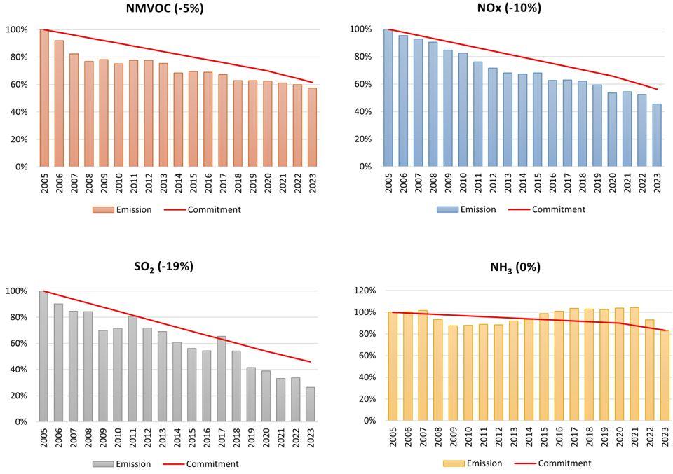 In previous years, Hungary’s commitments for ammonia (NH3) and PM2.5 were not achieved; however, in 2023 the country succeeded in meeting its ammonia commitment, while PM2.5 remains a challenge.