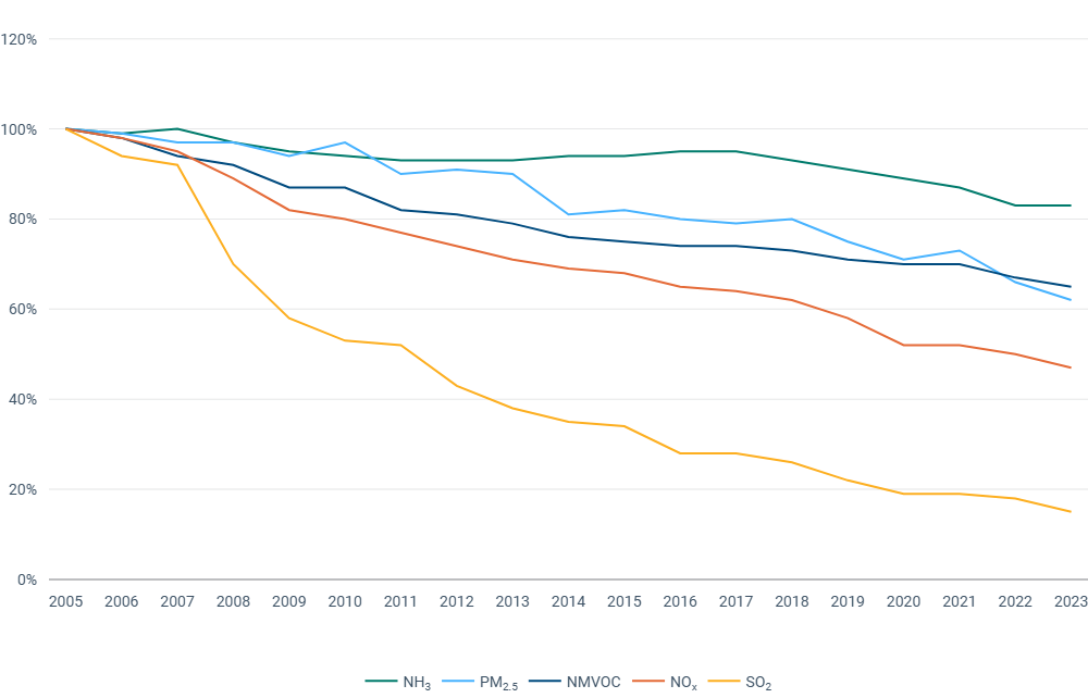 Az Európai Környezetvédelmi Ügynökség az ’Európa Környezete 2025’ jelentésében hangsúlyozta, hogy minden légszennyező anyag, melynek a kibocsátását szabályozták, jelentősen csökkenő tendenciát mutat 2005 óta. A szennyező anyagok esetében a legnagyobb kibocsátáscsökkenést a kén-dioxid (SO2) érte el (85 %), ezt követi a nitrogén-oxidok (NOx) (53 %), a nem metán illékony szerves vegyületek (NMVOC) (35 %), a PM2,5 (38 %) és az ammónia (NH3) kibocsátása (17 %).
