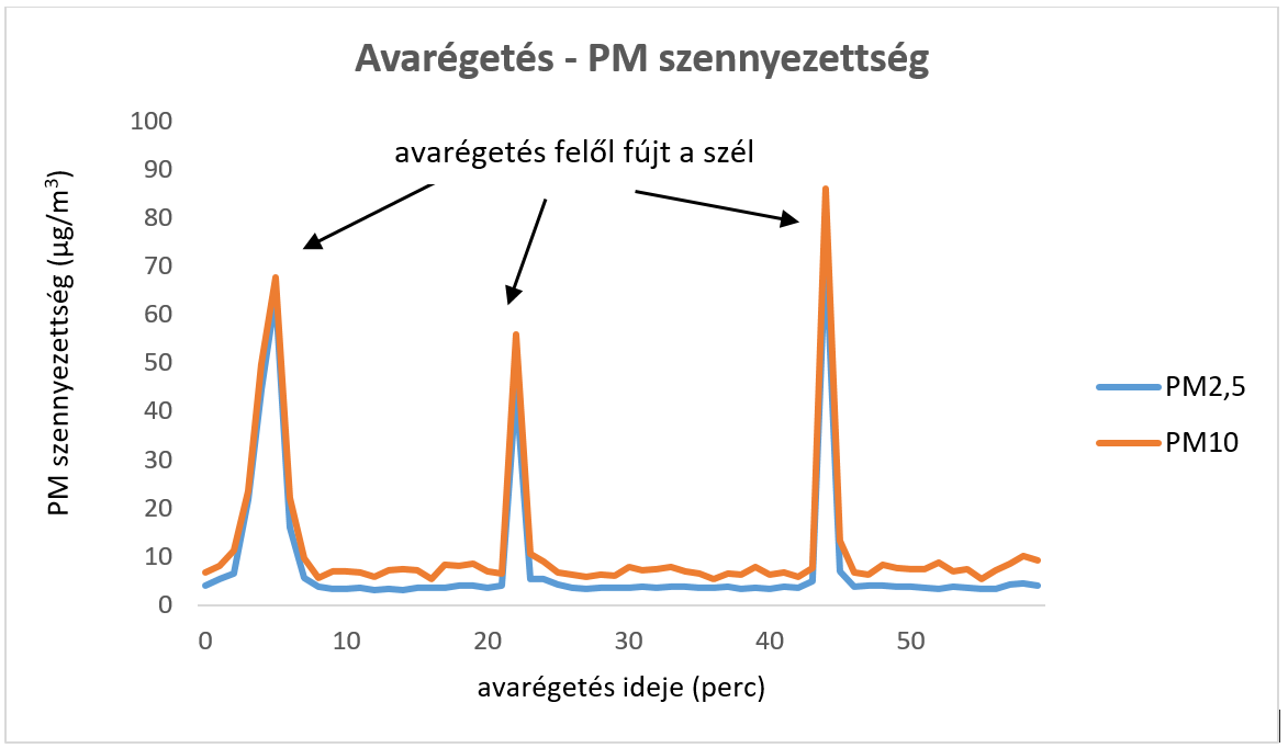 A mérési eredmények azt mutatják, hogy mikor az enyhe, változó irányú szél a mérőberendezések felé fújta az avarégetés füstjét, több mint tízszeresére nőtt a szennyezettség.