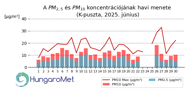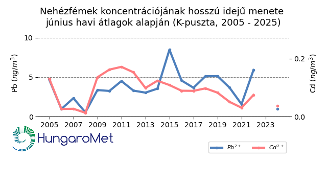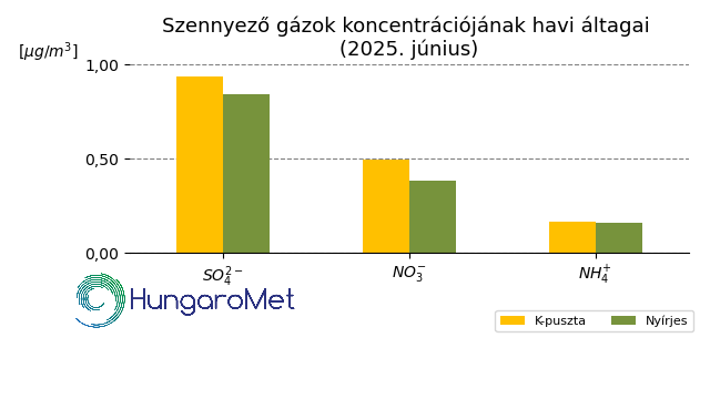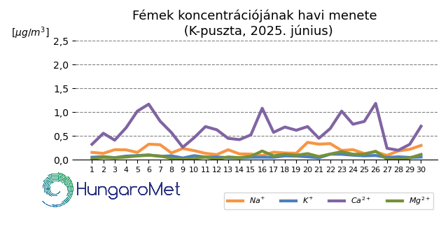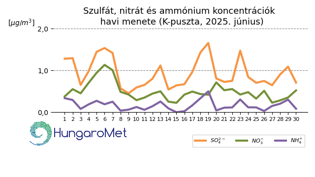 Három háttérszennyezettség-mérő állomáson (K-puszta, Nyírjes) mérjük a légkörben lebegő aeroszol részecskék szulfát, nitrát és ammónium tartalmát. K-pusztán emellett alkáli- és alkáliföldfémek, valamint nehézfémek koncentrációjának mérését is végezzük. Az ábrákon ezen összetevők koncentrációjának havi menete, havi átlaga, a sokévi átlagtól való eltérése, nehézfémek esetében pedig a hosszú idejű trend látható. A sokévi átlagot az 1990-2009-ig tartó húsz éves időszak adott havi átlagaiból képezzük. A hosszú idejű adatsor esetén szintén csak az adott hónap átlagát vesszük figyelembe (pl. minden év januári átlagkoncentráció), így kiküszöbölve a koncentrációk éves menetét. Az utolsó két ábrán a 10 és a 2,5 mikrométernél kisebb részecskék koncentrációjának havi menete látható a két mérőállomáson.