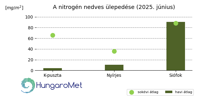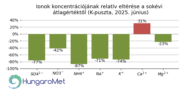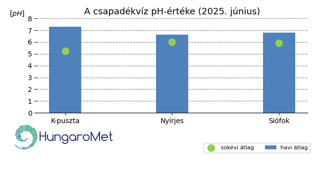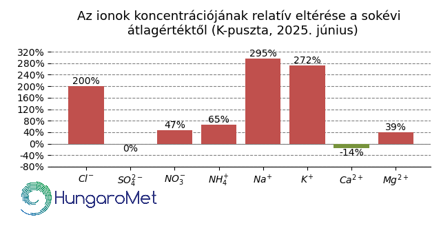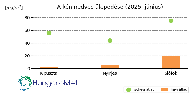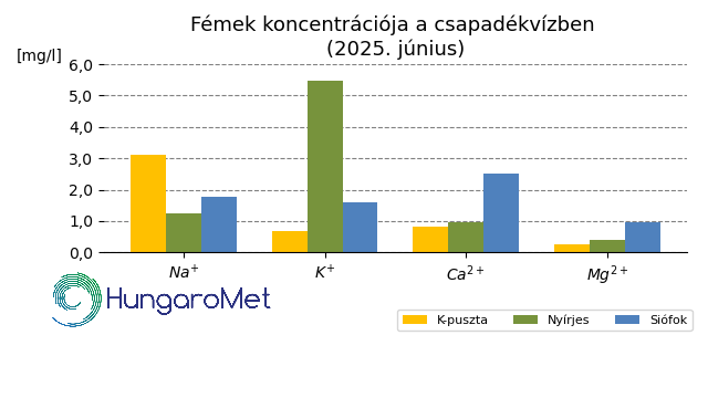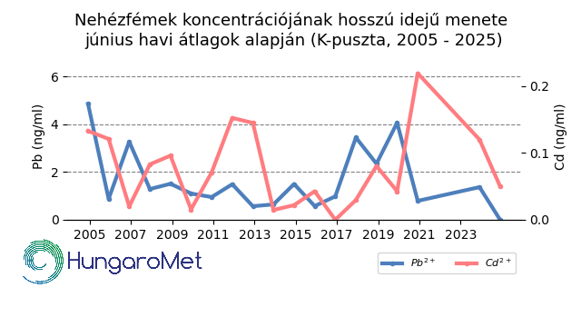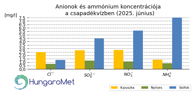 Csapadékvíz-mintavétel jelenleg 4 mérőállomáson történik: K-pusztán, Farkasfán, Nyírjesen és Siófokon. Az itt vett mintákból mérjük a klorid-, szulfát-, nitrát-, ammónium-, alkáli- és alkáliföldfém-ionok, illetve nehézfémek koncentrációját, emellett a csapadékvíz pH értékét és elektromos vezetőképességét is meghatározzuk. Az ábrákon az ion-koncentrációk csapadékmennyiséggel súlyozott havi átlaga, sokévi átlagtól való eltérése, nehézfémek esetében pedig a hosszú idejű trend látható. Az utolsó két ábra a kén és a nitrogén nedves ülepedésének számított havi összegét mutatja. A sokévi átlagot az 1990-2009-ig tartó húsz éves időszak adott havi csapadékmennyiséggel súlyozott átlagaiból képezzük. A hosszú idejű adatsor esetén szintén csak az adott hónap átlagát vesszük figyelembe (pl. minden év januári átlagkoncentráció), így kiküszöbölve a koncentrációk éves menetét.