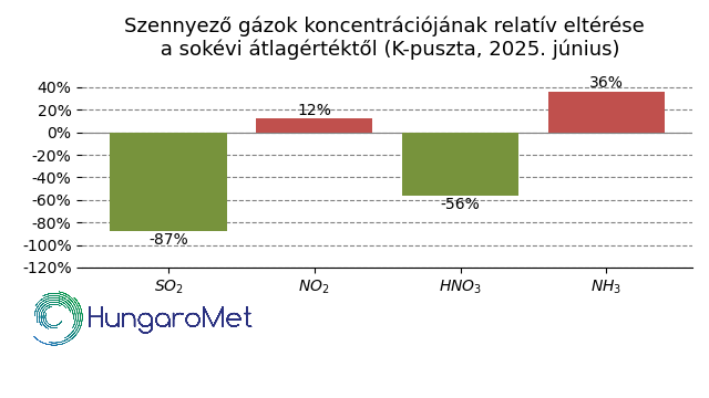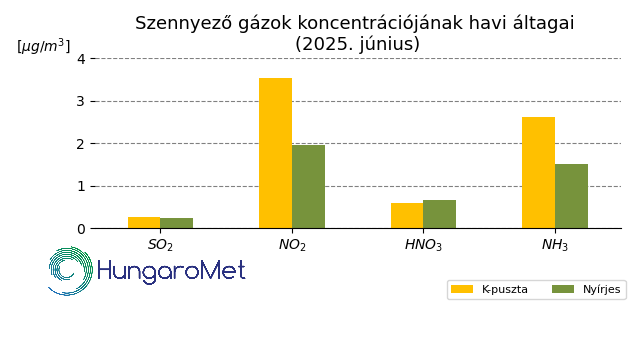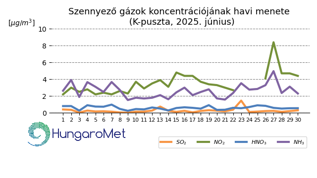 A levegő gáznemű szennyezői közül a kén-dioxid, a nitrogén-dioxid, az ammónia és a salétromsav koncentrációját három háttérszennyezettség-mérő állomáson (K-puszta, Nyírjes) mérjük, míg szén-dioxid mérések Hegyhátsálon folynak. Az ábrák ezen gázok havi menetét, a sokévi átlagtól való eltérését, illetve hosszú idejű trendjét mutatják. A sokévi átlagot az 1990-2009-ig tartó húsz éves időszak adott havi átlagaiból képezzük. A hosszú idejű adatsor esetén szintén csak az adott hónap átlagát vesszük figyelembe (pl. minden év januári átlagkoncentráció), így kiküszöbölve a koncentrációk éves menetét.