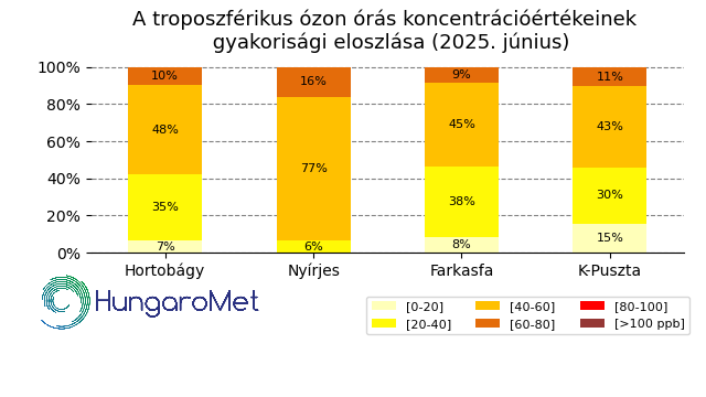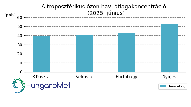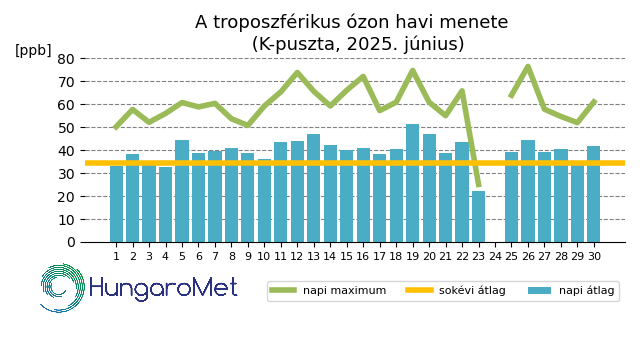 Magyarországon négy háttérszennyezettség-mérő állomáson zajlik néhány méteres felszín feletti magasságban a troposzférikus ózon koncentrációjának folyamatos mérése: K-pusztán, Farkasfán, Nyírjesen és Hortobágyon. Az első három ábra ezen mérések eredményeit mutatja be.
