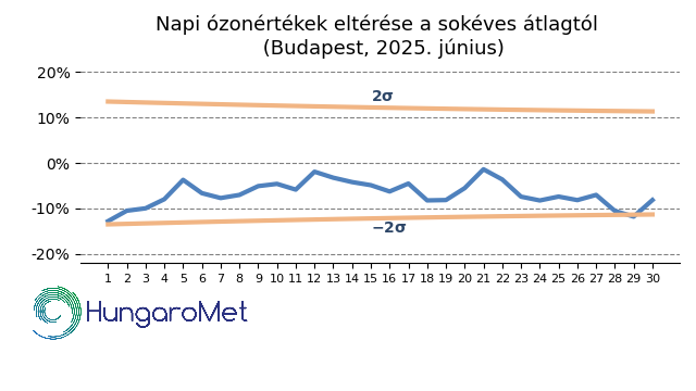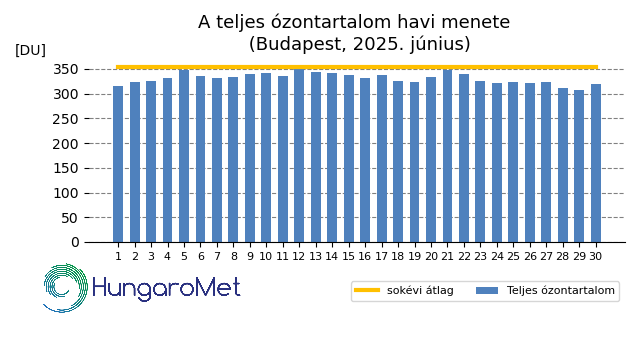A légkör teljes ózonmennyiségének kb. 90%-a a sztratoszférában található. A teljes ózonmennyiséget Dobson-egységben mérjük (DU). 1 DU megfelel annak az ózonmennyiségnek, ami a Föld felszínét 1013.25 hPa nyomáson és 0°C-os hőmérséklet mellett 0.01 mm vastagságban borítaná. Az ábrákon a Budapest feletti légkör teljes ózonmennyiségének alakulását láthatjuk.