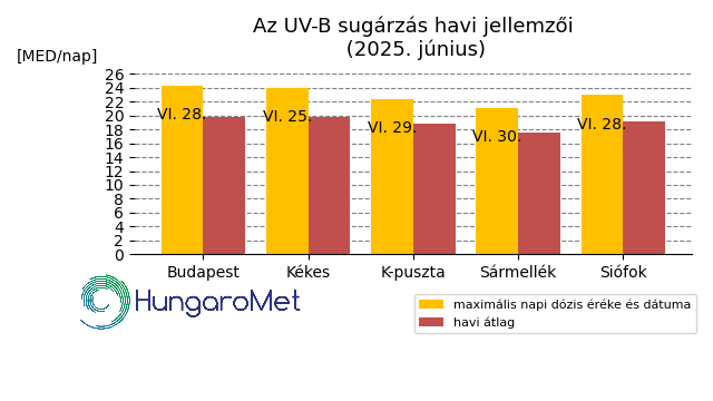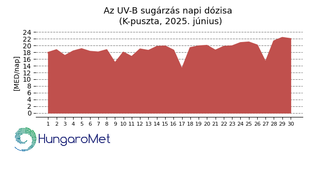 Az utolsó két ábrán az UV-B sugárzás k-pusztai napi dózisát, illetve a különböző mérőállomásokon észlelt maximális dózist és havi átlagértéket láthatjuk.